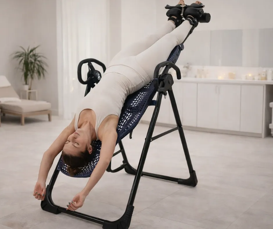 Gentle inversion encourages natural lengthening and release through the back and hips. Many clients notice a feeling of lightness and improved comfort afterward.